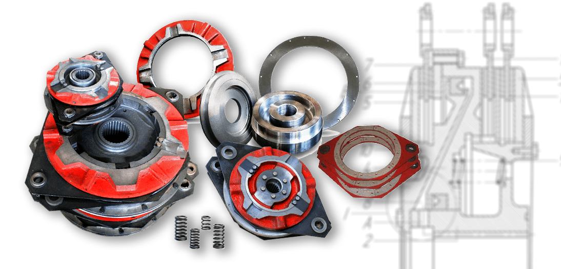 Конструкция состоит из корпуса, нажимных дисков, фрикционных пакетов, пружин и управляющего механизма. В момент подачи энергии нажимные элементы сжимают диски, обеспечивая сцепление. При отключении питания упругие элементы размыкают пары трения, а система торможения удерживает ведомый вал в фиксированном положении. Такой порядок работы одной конструкции решает две задачи: передача крутящего момента через кратковременное соединение валов и торможение ведомого вала при остановке оборудования.
